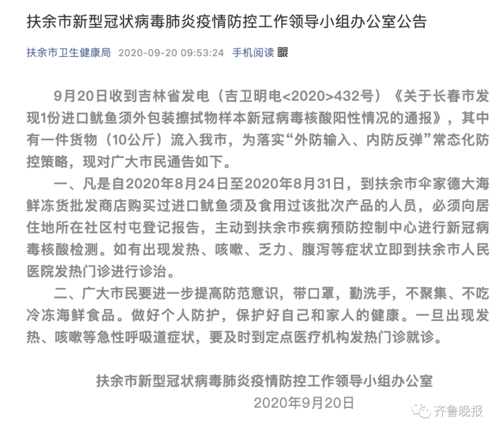 据吉林扶余市卫生健康局微信公众号消息,9月20日,扶余卫生健康局发布通报,当日该市收到吉林省发电(吉卫明电432号)《关于长春市发现1份进口鱿鱼须外包装擦拭物样本新冠病毒核酸阳性情况的通报》,其中有一件货物(10公斤)流入扶余市。