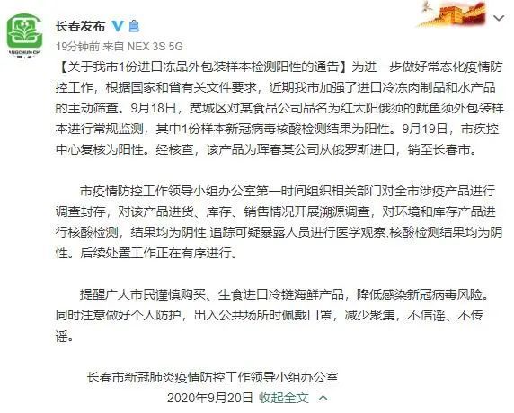 9月20日,长春市委网络安全和信息化委员会办公室发布通报称,9月18日,长春市宽城区对某食品公司品名为红太阳俄须的鱿鱼须外包装样本进行常规监测,其中1份样本新冠病毒核酸检测结果为阳性。9月19日,长春市疾控中心复核为阳性。经核查,该产品为珲春某公司从俄罗斯进口,销至长春市。
