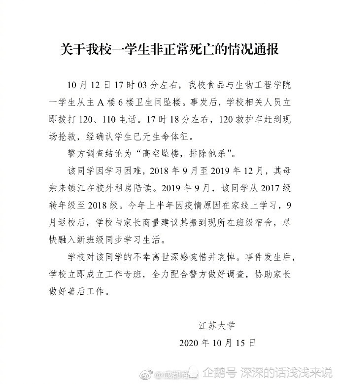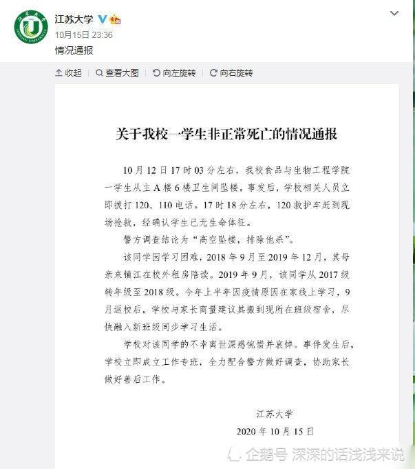 12日,湖北籍学生江苏大学坠亡,10月15日晚11时36分,江苏大学官方通报此事称,当地警方的调查结论为“高空坠亡、排除他杀”,学校对其不幸离世深感惋惜并哀悼。