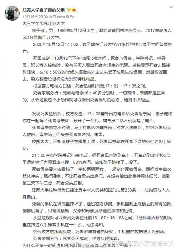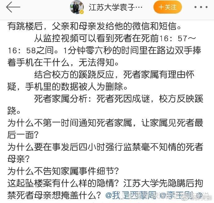 江苏大学坠楼学生家属发声#:怀疑手机信息被人为删除
