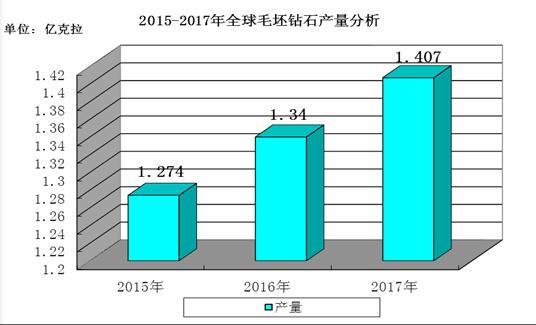 2015年的毛坯钻石产值为124亿美元,2016年毛坯钻石产值为138.8亿美元,受钻石价格的影响2017年毛坯钻石产量增加,但产值略微有下降趋势。