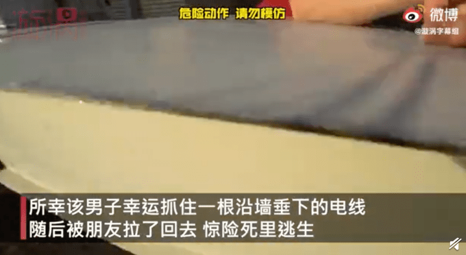 原标题:惊魂一刻!俄男子跑酷脚滑摔下房顶死里逃生,侥幸抓住电线狂喘气