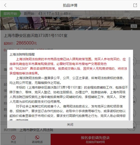 上海市房管局相关负责人表示,该房源为上海法拍房纳入限购的首套房源。竞买人参与竞买的,应当事先确定在上海具有购房资格,必要时可致电市房地产交易服务热线“962269”具体咨询限购政策。