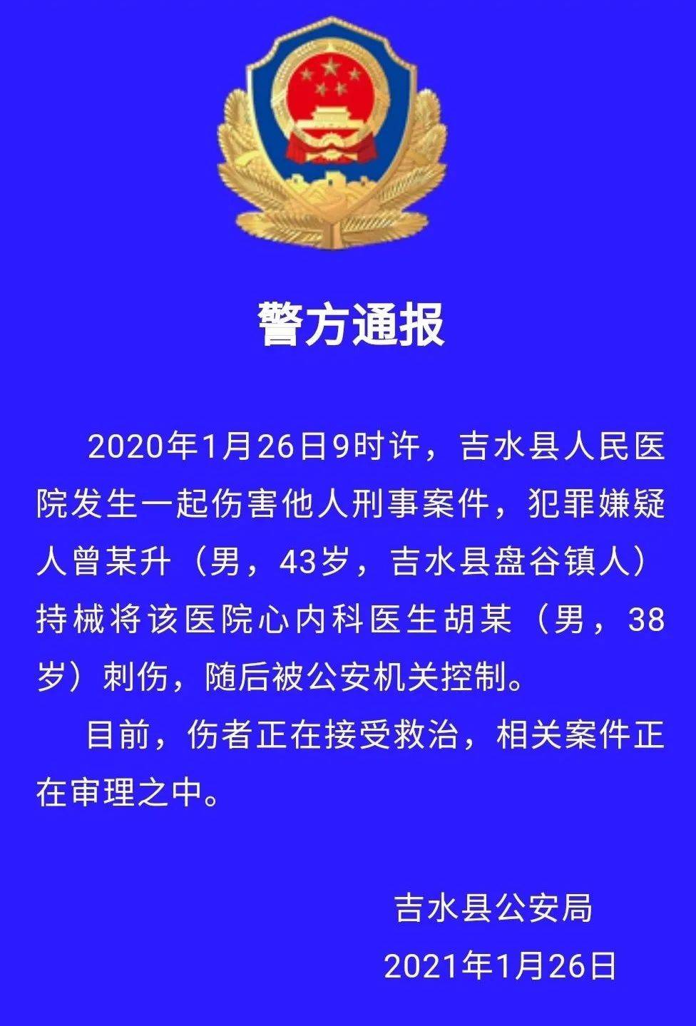 26日15时许,吉水县公安局通报称,26日9时许,吉水县人民医院发生一起伤害他人刑事案件,犯罪嫌疑人曾某升(男,43岁,吉水县盘谷镇人)持械将医院心内科医生胡某(男,38岁)刺伤,随后被公安机关控制。目前,伤者正在接受救治,相关案件正在审理之中。
