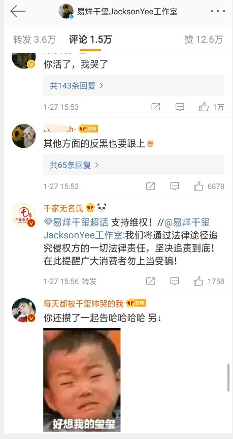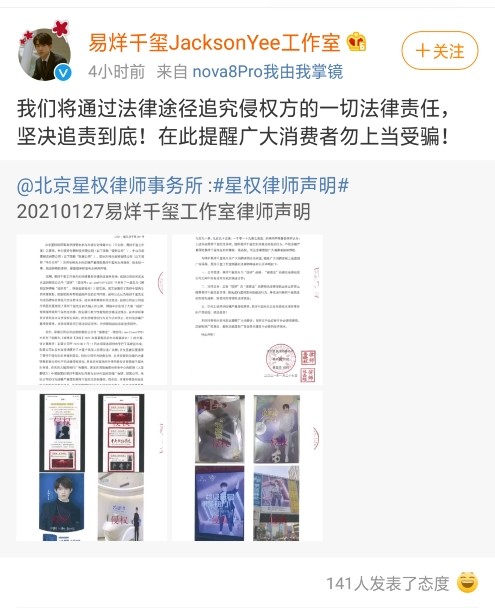 事情经过也很简单,即易烊千玺这边并未授权,但是相关公司擅自用易烊千玺的照片和姓名来进行诱导性的销售,指向性很强,为此侵犯了易烊千玺的肖像权和姓名权,在多次警告后仍未更改,可以说行为很恶劣了,属于知道自己的行为违法但依旧坚持犯错,令人无语至极,易烊千玺工作室的声明一出,立即获得了粉丝的力挺,一位粉丝激动的说:“你活了,我哭了”,其他网友发表态度称:“支持维权。”
