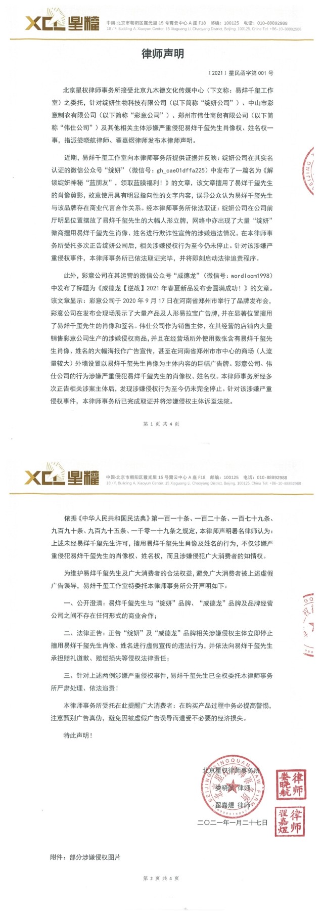 身为艺人,总是备受关注的,如TFBOYS三位成员,从学生时代开始,就因为出道而备受关注,一举一动都曾引发过热议,近日易烊千玺备受困扰,因为他的肖像权受到了恶意侵犯,对于一些过分明显的举动,易烊千玺工作发声明维护了易烊千玺的相关权益:“我们将通过法律途径追究侵权方的一切责任,坚决追责到底,在此提醒广大消费者勿上当受骗。”声明内容显示:绽妍生物科技有限公司、郑州市伟仕商贸有限公司以及其他相关主体涉嫌严重侵犯易烊千玺先生肖像权、姓名权,擅用其肖像、姓名进行欺诈性宣传的涉嫌违法情况,在本律师事务所受委托多次正告后,相关涉嫌侵权行为至今未停止,本律师事务所已依法取证完毕,并将即刻启动法律追责程序。“