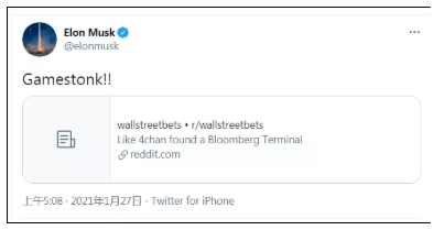 周二盘后,马斯克也发表推特,为游戏驿站的飙升再添了一把火。他在推特上高呼“Gamestonk!!”(Stonk有“猛烈炮击”之意),并且发布了一个链接,链接指向了美国社交论坛Reddit上wallstreetbets板块,而这一板块正是炒作游戏驿站的散户股民的主要聚集地。