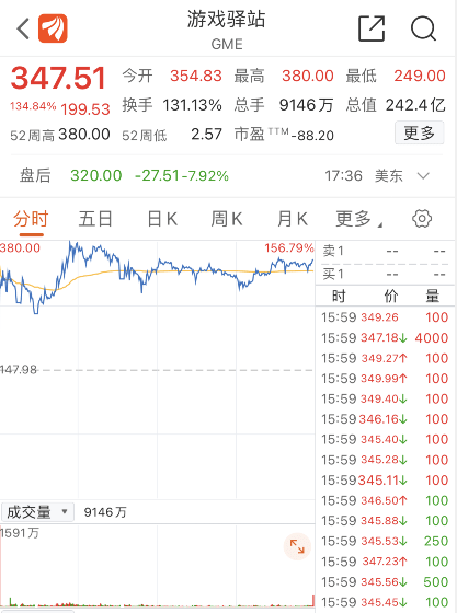 1月28日,游戏驿站股价直接跳空高开,收盘涨幅达134.84%,换手率131.40%。今年以来,游戏驿站股价已经涨超1700%。