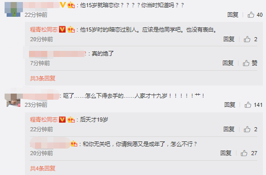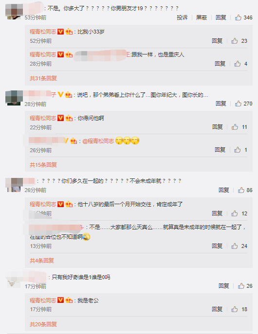 关于两个人什么时候在一起的,是不是未成年就开始了,程青松表示:“他十八岁的最后一个月开始交往,肯定成年了”,还表示小男友歌词里面的15岁就暗恋,但对象不是自己,自己的小男友到后天才19岁。不过看得出,许多网友对此难以接受,甚至有些怀疑人生。