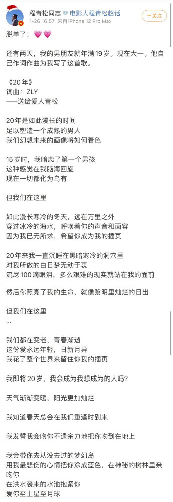 1月26日中国电影金扫帚奖创始人程青松发文宣布了自己出柜的消息,称自己的男朋友还有两天就满19岁,现在正在上大一。他还自己作词作曲为自己写了一首歌,歌词里写着:“20年是如此漫长的时间,足以塑造一个成熟的男人”、“15岁时,我暗恋了第一个男孩”、“然后你照亮了我的生命,就像黎明里灿烂的日出”。