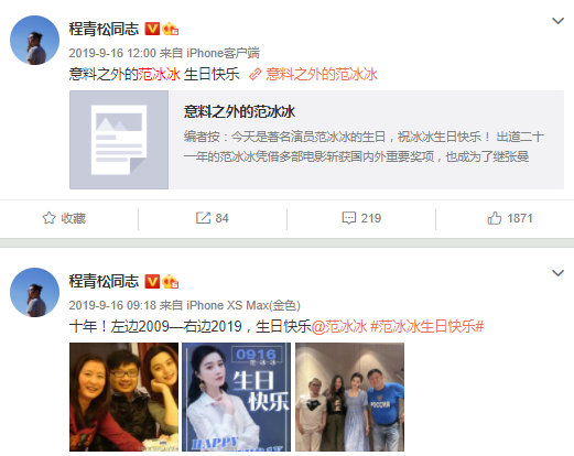 程青松的履历可谓非常丰富,他跟圈内不少艺人关系都不错,在范冰冰陷入负面风波后更是多次力挺她,还多次发文给范冰冰庆生。