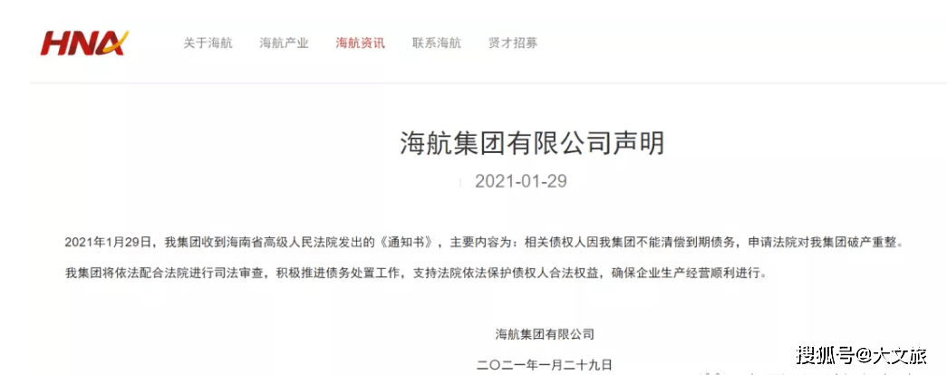 海航集团今日发布通告:2021年1月29日,我集团收到海南省高级人民法院发出的《通知书》,主要内容为:相关债权人因我集团不能清偿到期债务,申请法院对我集团破产重整。