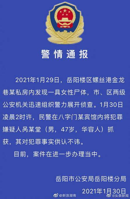 1月30日,湖南岳阳。有网友反映,一小区发生碎尸命案,公安部门正在现场进行处置。据知情人称,疑因情感纠纷,一男子将一名女性杀害后碎尸。警方通报:47岁嫌疑人在宾馆内被抓获,对其犯罪事实供认不讳。