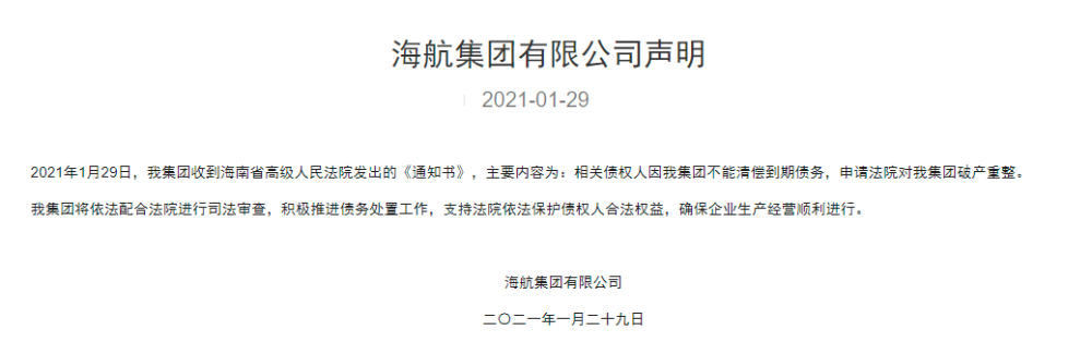 1月29日海航集团官方微信公众号发出声明:2021年1月29日,我集团收到海南省高级人民法院发出的《通知书》,主要内容为:相关债权人因我集团不能清偿到期债务,申请法院对我集团破产重整。