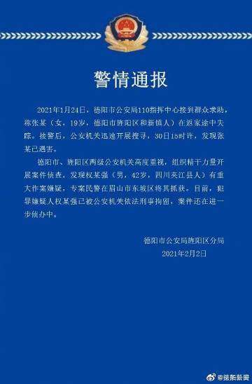 2月2日,四川德阳旌阳公安发布通报称,#女大学生失联被害案嫌犯被刑拘# 。据此前报道,1月24日,西南科技大学四川籍19岁大二女生张某驾校学车后失联。报道称,女孩家属表示,女孩遇害的公交车站地点偏僻,生前受到恶劣伤害,并质疑驾校之前承诺的包接包送也未能实现,出事后驾校也未与家属联系过。