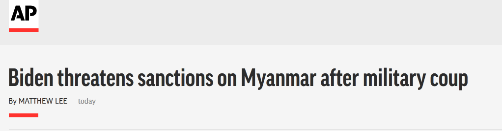 拜登在声明中表示,缅甸军方的行为是“对该国向民主和法治过渡的直接攻击”。“过去十年,基于缅甸的民主进程,美国取消了对其制裁。”拜登进一步称要对此次事件的负责人采取行动,“当这一进程出现逆转,就迫使我们立即对制裁法律和相关机构进行审查,然后采取适当行动。”