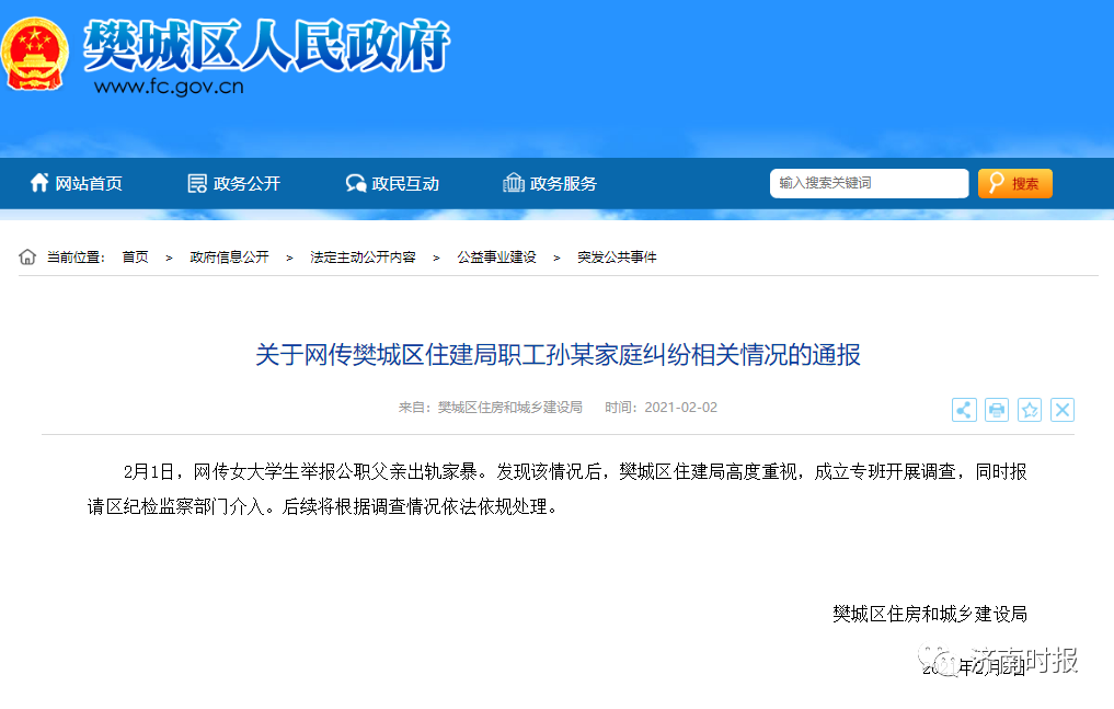 2月1日,网传女大学生举报公职父亲出轨家暴。发现该情况后,樊城区住建局高度重视,成立专班开展调查,同时报请区纪检监察部门介入。后续将根据调查情况依法依规处理。