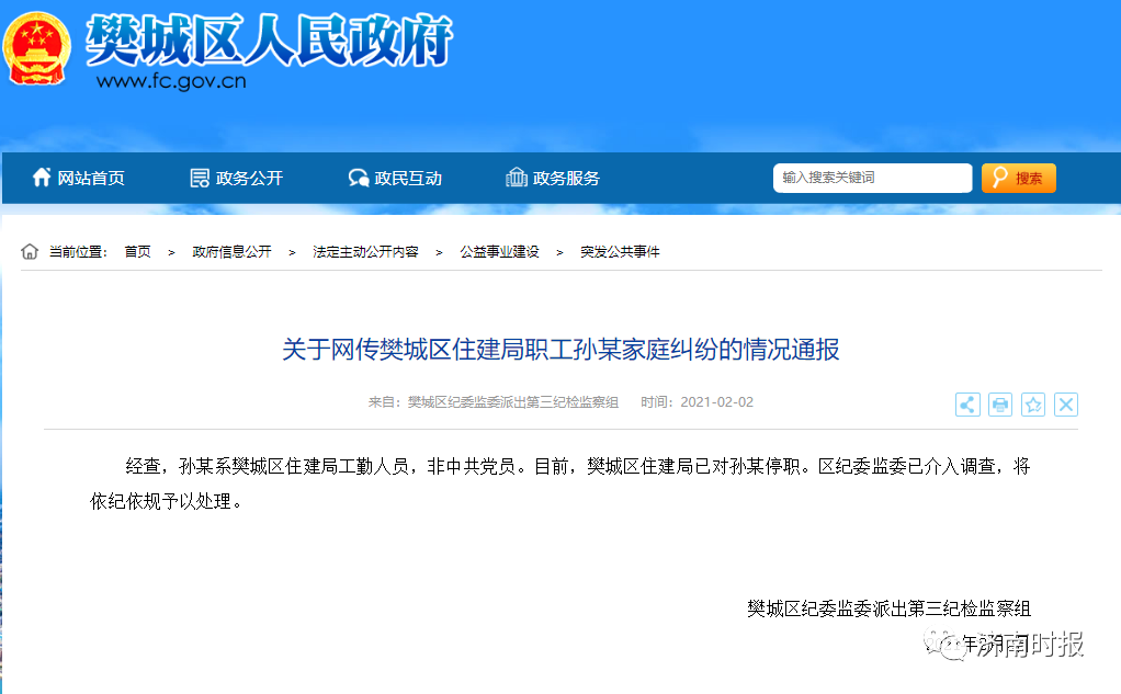 关于网传樊城区住建局职工孙某家庭纠纷的情况通报