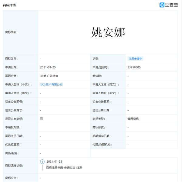1月25日,华为技术有限公司申请注册“姚思为”、“姚安娜”、“YAO ANNA”、“YAO SIWEI”、“Annalbel YAO”商标,其中国际分类包含30类方便食品、14类珠宝钟表、38类通讯服务等,目前商标状态为注册申请中。