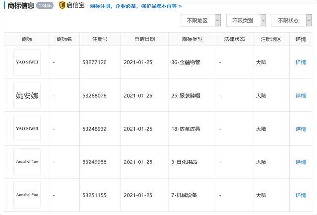 的商标注册信息,涉及金融物管、服装鞋帽、皮革皮具、日化用品、机械设备、通讯服务等,一度引发了网友的热议。