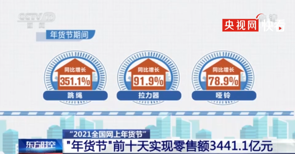 商务大数据监测显示,“2021全国网上年货节”启动前10天,全网零售额达3441.1亿元人民币。其中,#年货采购异地订单数量增长60%#,主要是北、上、广、深等地与三线及以下城市间发单量快速增长,多为互相寄递年货与土特产品。全网除菌类洗衣机销售额同比增长137.8%,跳绳、拉力器、哑铃等宅家便捷健身器材同比分别增长351.1%、91.9%和78.9%。