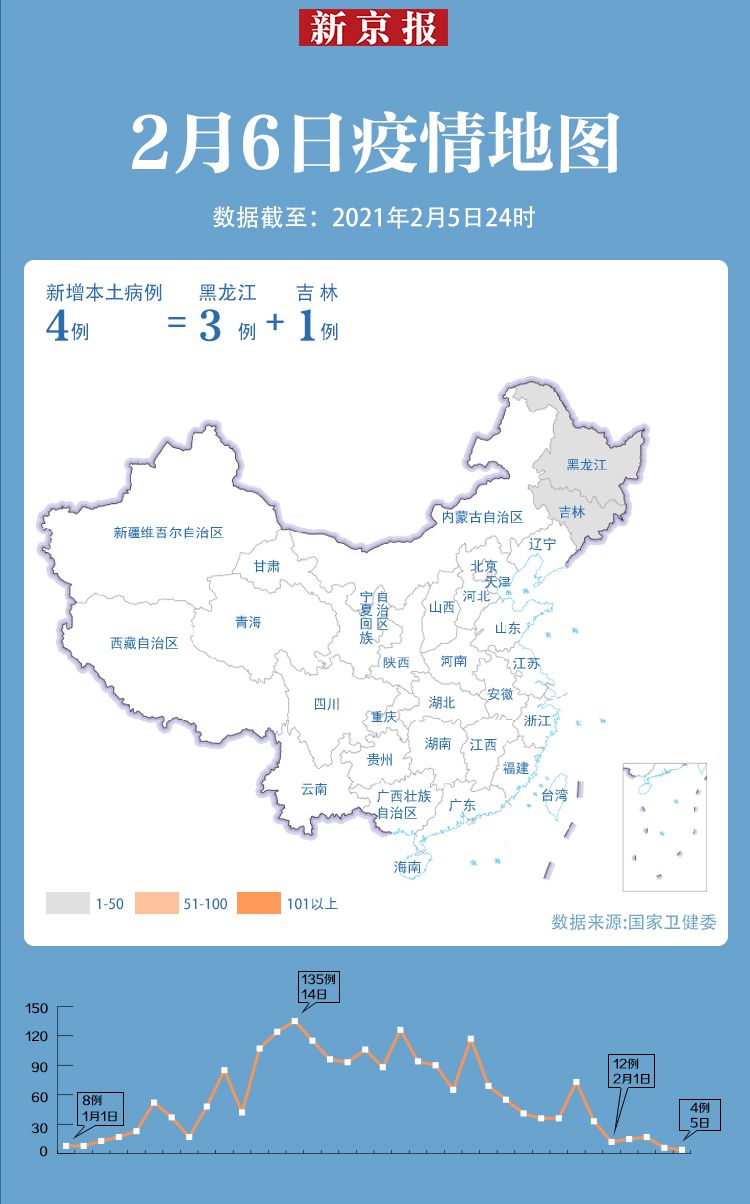 新京报快讯 据国家卫健委网站消息,2月5日0 24时,31个省(自治区、直辖市)和新疆生产建设兵团报告新增确诊病例12例,其中境外输入病例8例(上海5例,天津1例,广东1例,陕西1例),本土病例4例(黑龙江3例,吉林1例);无新增死亡病例;新增疑似病例1例,为境外输入病例(在上海)。