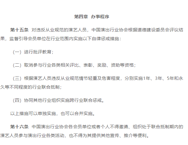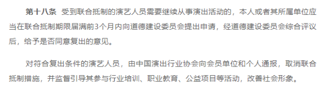 整份“管理办法”共5个篇章22条细则,从从业规范到监管方式都给出了管理指引,尤其是对于违反从业规范的演艺人员,建议给予1年、3年、5年或永久的等不同程度的行业联合抵制。对于受到联合抵制的演艺人员如何才能“复出”,也给予了明确要求。这也是首次对于“对有违规行为的艺人封杀和在其改过后复出”有了比较权威的管理流程。