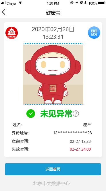 若您所到访的地区中不包括中高风险地区,且无其他异常情况——您的健康状态将转为未见异常,可正常使用北京“健康宝”所提供的的各项功能。
