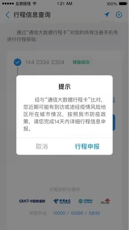 此时系统将通过“通信大数据行程卡”对您的个人中心所有手机号码一一核验,您仅需输入获取的手机验证码点击“提交”即可。