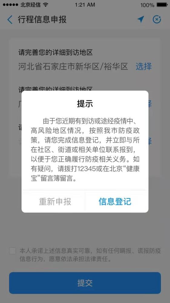 若您所到访的地区中包含中高风险地区——北京“健康宝”将出现以下弹窗,请您进行“信息登记”,并与所居住社区、单位联系报到,履行防疫相关义务。