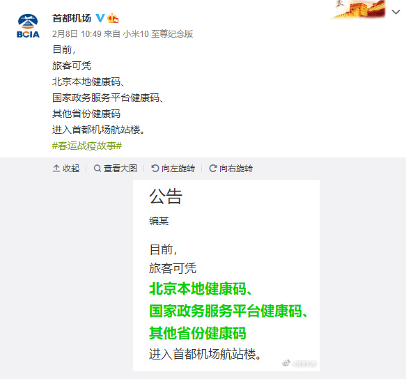 2月8日晚间,北京首都国际机场发布公告称,目前,旅客可以凭北京本地健康码、国家政务服务平台健康码、其他省份健康码进入首都机场航站楼。