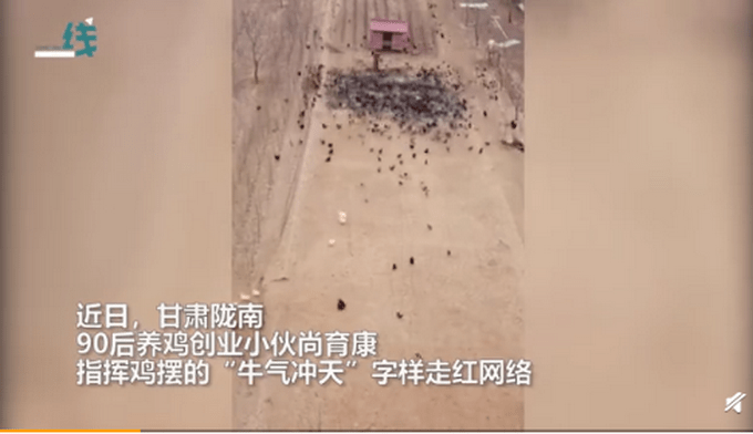 近日,甘肃陇南,90后养鸡创业小伙尚育康指挥鸡摆的“牛气冲天”字样走红网络。据了解,小伙已经养殖4000多只山鸡,平时无聊时候会“指挥”鸡摆出各种图案。尚育康介绍说,图案是事先在地上画印子,然后按着印子撒食物鸡就会跟着过来。之前也摆过其他造型,比如医生、福字、还帮网友摆名字向女朋友告白等。因指挥鸡摆图案走红,网友称他为“鸡司令”。