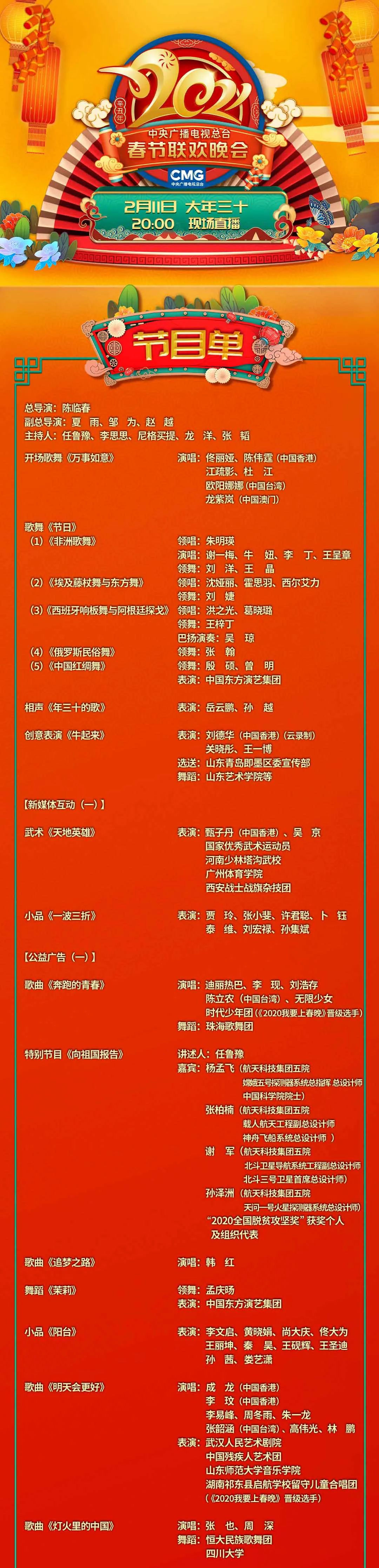 《2021年春节联欢晚会》紧扣时代主题、紧跟社会发展、紧贴火热生活,把中国共产党一百年来的光荣历程、脱贫攻坚的伟大成就以及疫情防控的战略性成果在多个作品中进行艺术性表达,在“欢乐吉祥、喜气洋洋”的新春氛围中为全球华人奉上情意浓浓、祝福满满的文化盛宴。