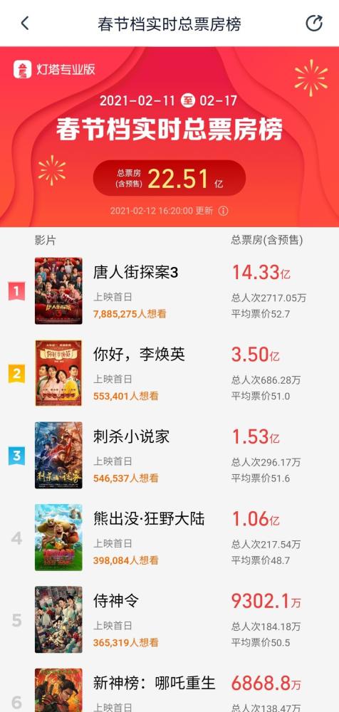 2月12日下午13时40分,据灯塔实时数据,2021春节档期内(2月11-17日)总票房(含预售)破20亿元。《唐人街探案3》以12.87亿居于春节档总票房冠军,《你好,李焕英》超3亿排在第二,《刺杀小说家》1.29亿。下午16时20分,总票房已经破22亿,《唐探3》破14亿,吸金速度的确惊人。