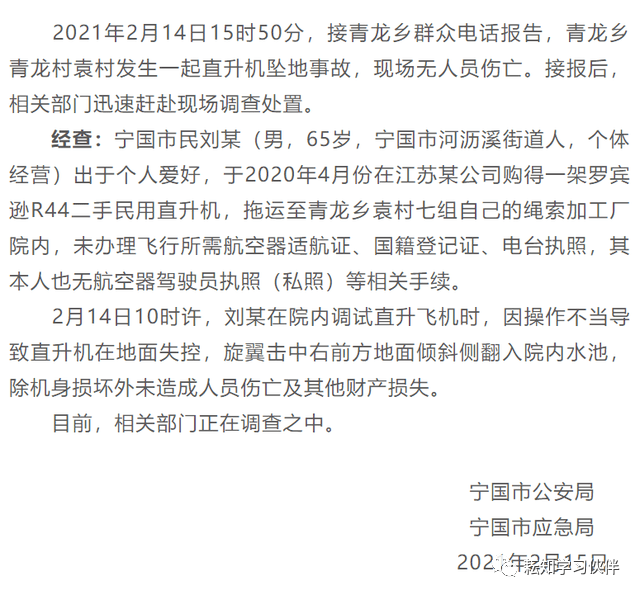 据“宁国发布”微信公众号消息,2021年2月14日15时50分,接青龙乡群众电话报告,青龙乡青龙村袁村发生一起直升机坠地事故,现场无人员伤亡。接报后,相关部门迅速赶赴现场调查处置。