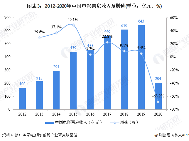根据前瞻产业研究院分析,从电影票房收入来看,2012-2019年,中国电影票房收入持续增长,并成功突破600亿大关。2019年,我国票房收入实现643亿元,较2018年增长5.4%,增速整体呈现下滑态势。2020年,我国电影票房收入仅为204亿元,不到2019年票房收入的4成。