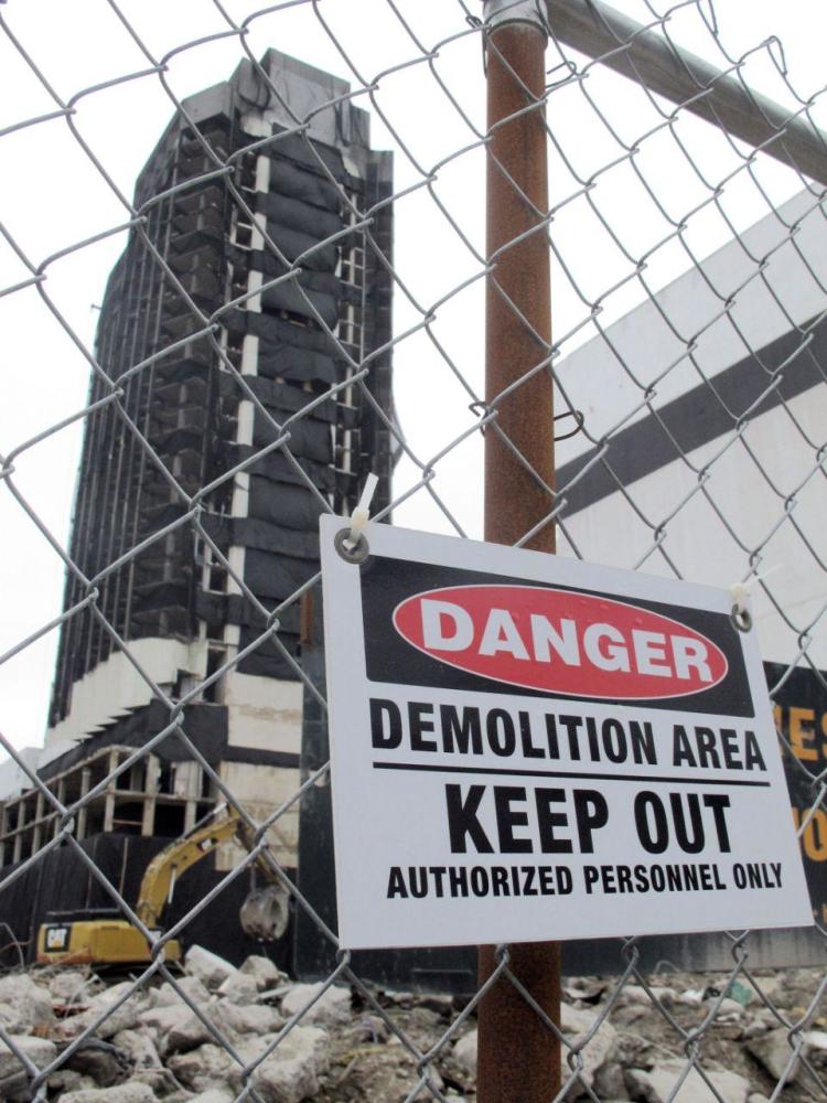 拆除人员事先在大楼支撑结构的关键位置放置好了炸药,周三上午9点,炸药从大楼下面炸开,碎片朝稍微偏北偏东北方向坠落。消防队长斯科特·埃文斯(Scott Evans)说:“就像一副纸牌一样崩溃,”