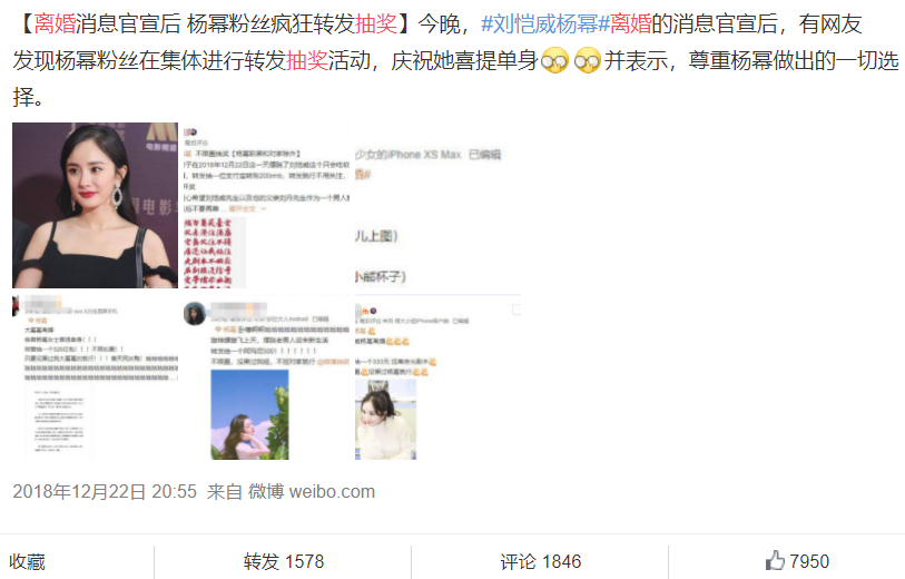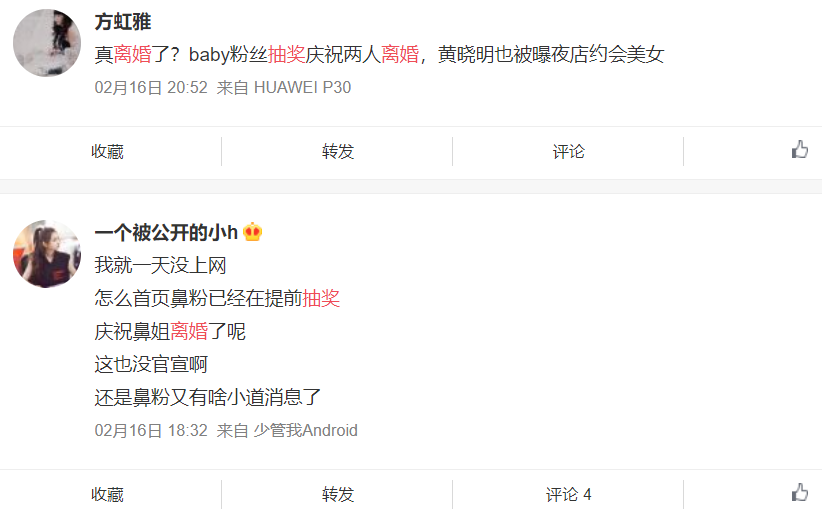 2月16日,甚至有baby的大粉在抽奖庆祝:终于和黄晓明离婚了。2018年12月22日,杨幂和刘恺威离婚时,杨幂粉丝也抽奖庆祝了。所以,难道baby的大粉得知了什么内幕消息吗?如果他们真的离婚了,那就可以理解为什么“黄晓明逛夜店”的旧闻会再次被翻出来了。