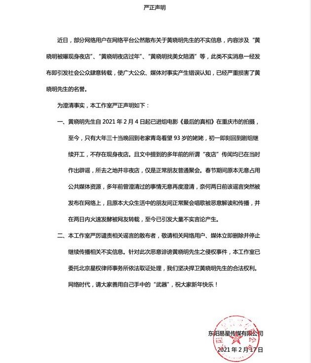 序言:近日,有网友爆料称,过年的时候在夜店偶遇黄晓明,还有十几名美女陪同,引发争议。2021年2月17日,黄晓明工作室在微博发布严正声明,称网传内容皆为不实消息。