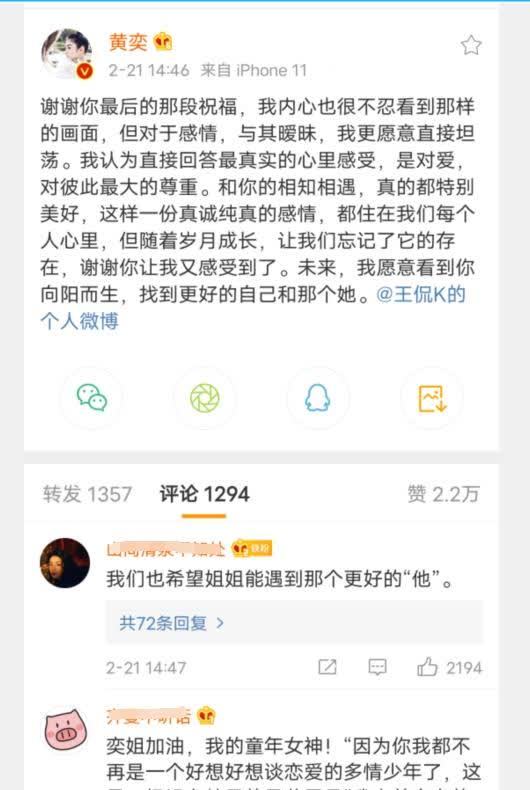 黄奕发博文称:“对于感情,与其暧昧,我更愿意直接坦荡,我认为直接回答最真实的心里感受,是对爱,对彼此最大的尊重,未来,我愿意看到你向阳而生,找到更好的自己和那个她。”