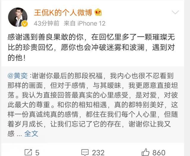 王侃转发了黄奕的博文回应:“感谢遇到善良果敢的你,愿你也会冲破迷雾和波澜,遇到对的他。”