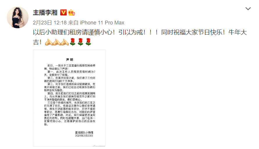 在声明中说道,离开之前已经请人做了打扫,并且对于破损做了赔偿,而房东却将打扫之前视频发布出去,显然别有用心。