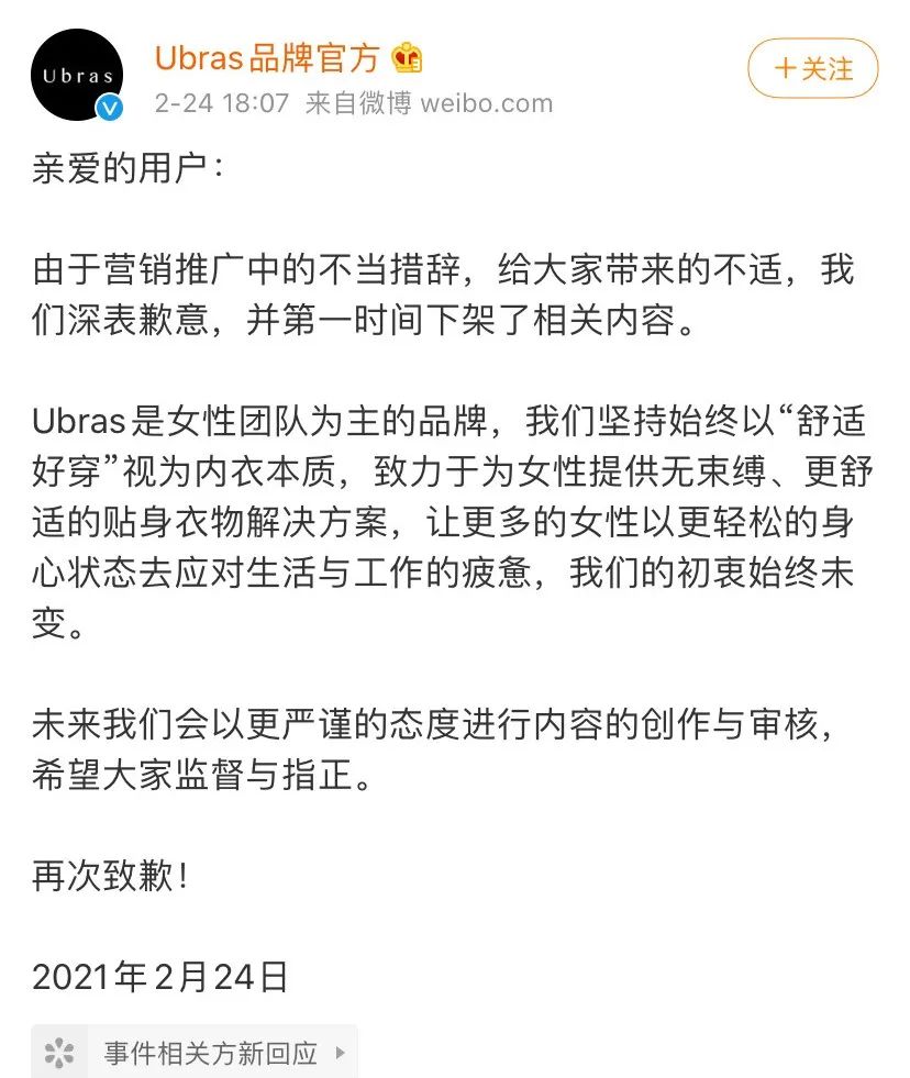 随后,李诞删除了相关带货视频。24日晚,Ubras品牌在官方微博上道歉,称“由于营销推广中的不当措辞,给大家带来的不适,我们深表歉意,并第一时间下架了相关内容。”
