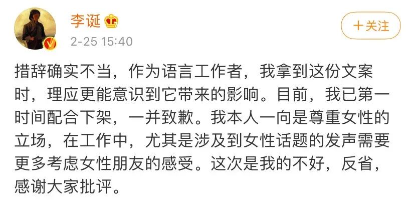 25日下午,李诞在社交媒体上道歉,称“措辞确实不当,作为语言工作者,我拿到这份文案时,理应更能意识到它带来的影响。目前,我已第一时间配合下架,一并致歉。我本人一向是尊重女性的立场,在工作中,尤其是涉及到女性话题的发声需要更多考虑女性朋友的感受。这次是我的不好,反省,感谢大家批评。”