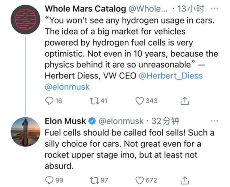 害怕竞争?马斯克称燃料电池是“智商税”