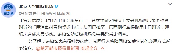 3月14日,北京大兴国际机场在其官博发布消息:3月12日18:36左右,一名女性旅客将位于大兴机场四层服务柜台附近的手用消毒剂置物架拔出后,从四层抛至二层西侧行李提取厅出口附近,现场未造成人员受伤。该旅客随后被机场公安民警带走调查。