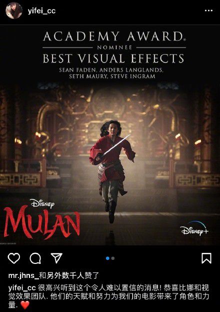 《花木兰》获奥斯卡双提名 刘亦菲发文祝贺团队