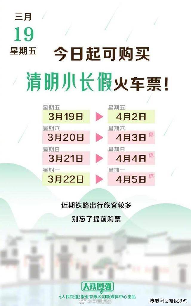 据@中国铁路 消息,今起可购买清明小长假火车票。3月19日起,可以购买4月2日的火车票,3月22日起可购买4月5日的返程车票。