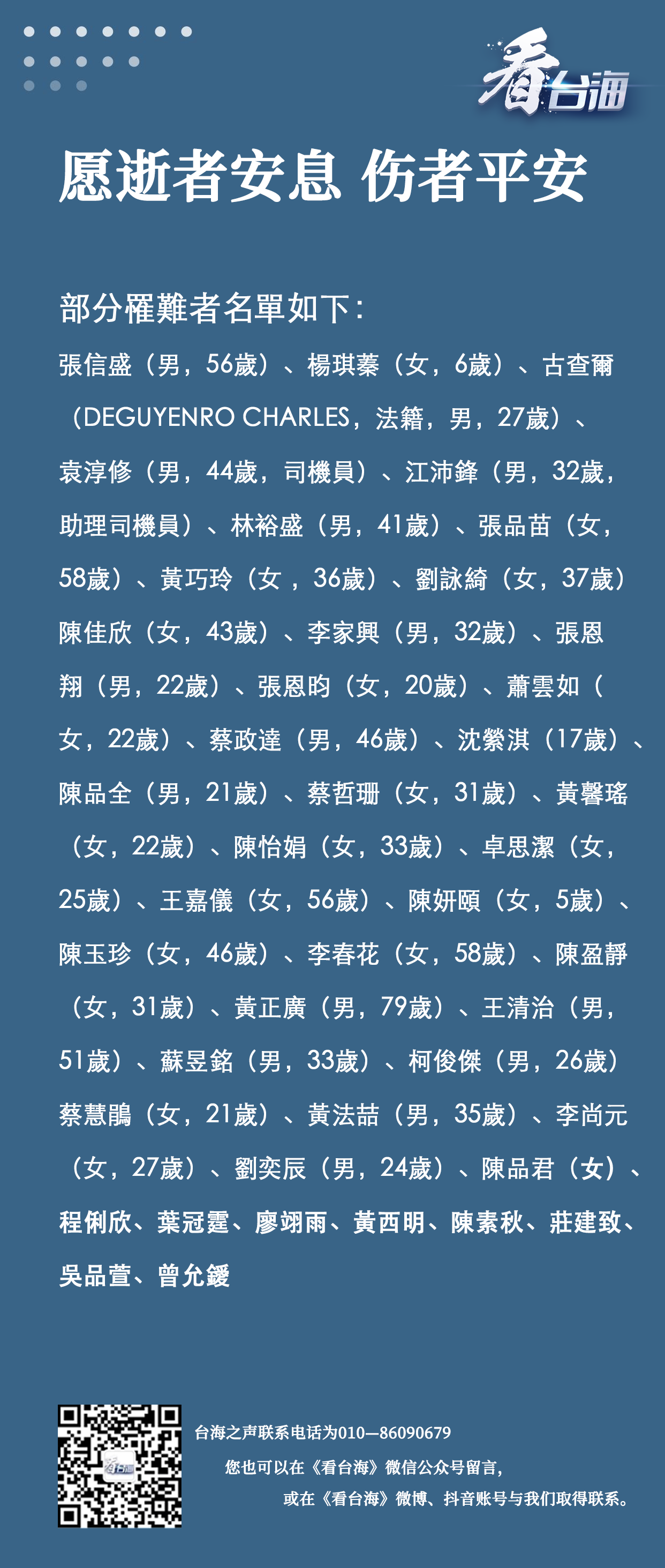 台湾列车脱轨事故部分罹难者名单公布 愿逝者安息