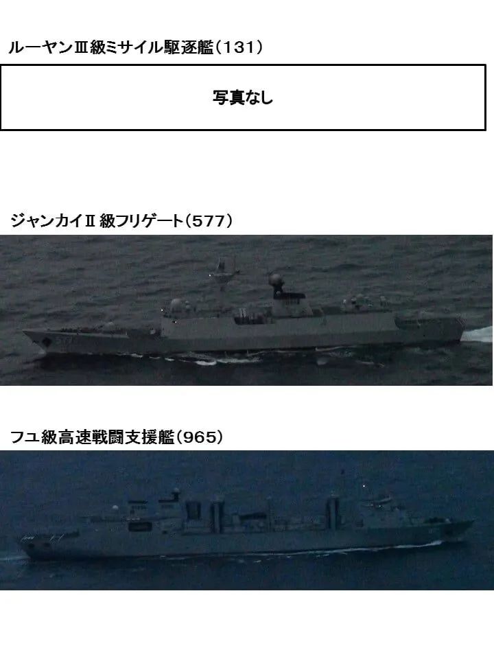 日本自卫队拍摄到的“黄冈”舰和“呼伦湖”舰日本防卫省统合幕僚监部在通报中指出,六艘军舰中,除了“辽宁”舰之外,另外5艘军舰分别是055型驱逐舰“南昌”舰,052D型驱逐舰“成都”舰、“太原”舰,054A型护卫舰“黄冈”舰,901型综合补给舰“呼伦湖”舰。这6艘军舰随后南下,经过冲绳本岛和宫古岛之间海域,向西太平洋驶去。